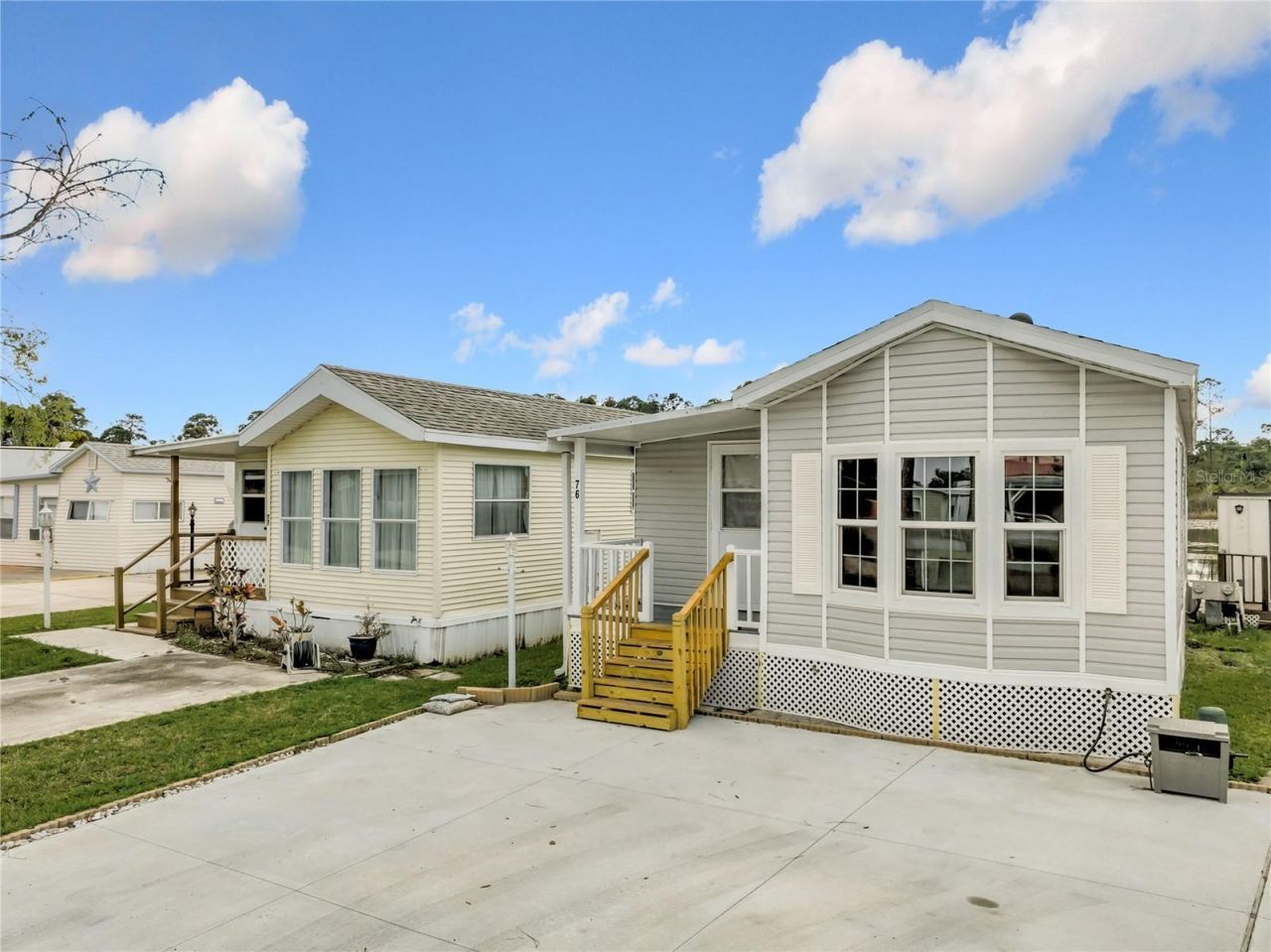 LAKE FRONT PROPERTY! - WELCOME TO THE KOVE ESTATE 55+ CO-OP Community Resort Style Living at its finest. RETIRE WITH CONFIDENCE and INVEST in your little piece of PARADISEa premier 55+ community in Osteen Fl.. There is no lot rent, as a share in the community conveys with the sale. The monthly cooperative fee (HOA) $219 Includes Water/Sewer/Trash. Enjoy Year Round 9 Hole Golf Corse, 2 pools, one heated, tennis courts, pickleball, community events and the peaceful nights all in your very own gated community. This charming 1996 oasis is high and dry. This unit features 1 bedroom, 2 FULL BATHROOMS with an Den/Extra private Sleeping space This home offers Newer Windows tons of natural light. Family Room with an Updated Kitchen combination that offers a cozy and comfortable living space. Recently Releveled, Newer Subfloors and Flooring, Updated bathrooms, Newly Expanded Driveway/Parking, New Skirting, Updated Electrical, Newly plastered and painted interior. Conveniently located off SR415, minutes to Sanford, Deltona, New Smyrna Beach. Call TODAY to View. 55+ Community CASH ONLY CO-OP Community. HOA includes, Water, Sewer and Trash Pickup NEWER ROOF IN 2018, NEWER REFRIGERATOR 2022, NEWER HVAC SYSTEM, 8'X6' SHED INSTALLED 1998 - SHED HAS WASHER USE WITH COLD WATER ONLY. (MEASUREMENTS AND INFO IS NOT WARRANTED, BUYER AND/OR BUYER'S AGENT TO VERIFY)